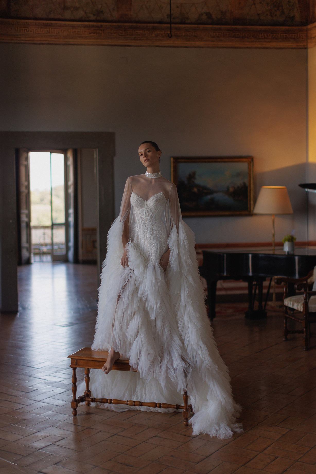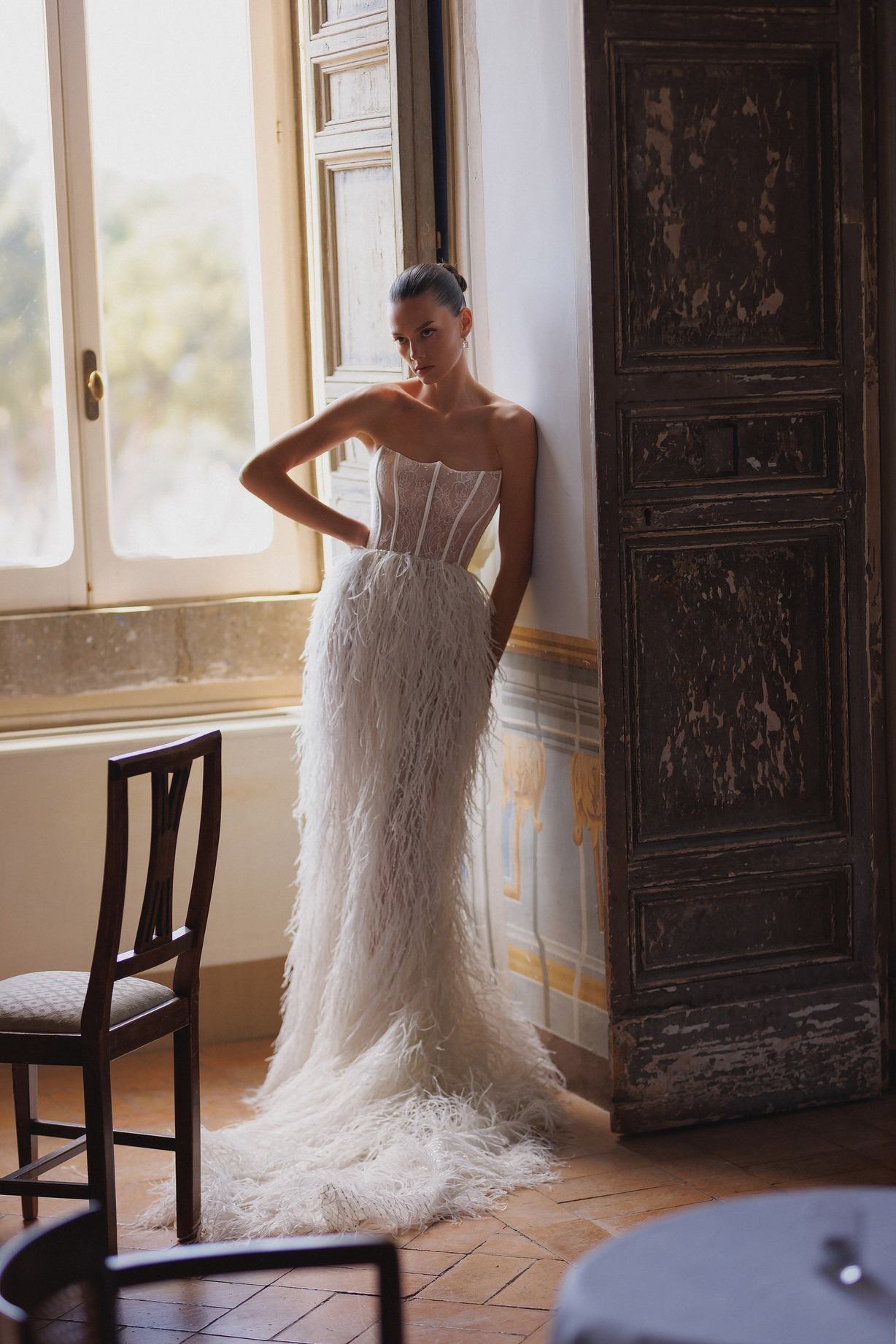 Crafted from the finest lace, feathers, weightless tulle, and glossy mikado, the collection allows brides to express their unique personalities while perfectly capturing the mood of their day. The L’Unico collection is especially notable for its signature corset details, adorned with sophisticated embellishments and creative cutouts, making each gown a true work of art.