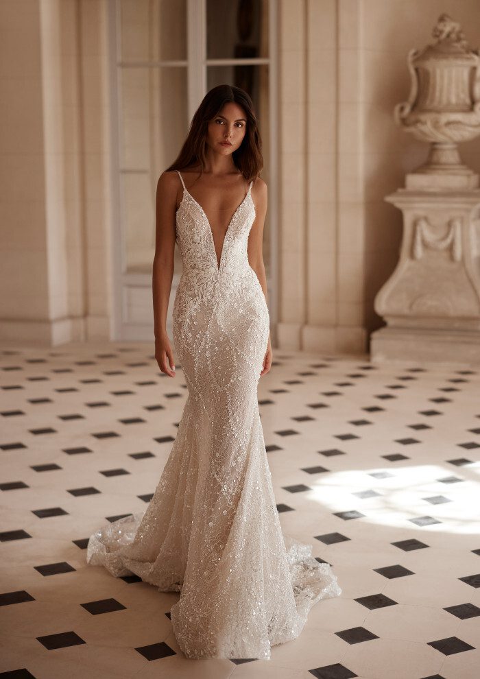 Simply gorgeous is the brand new Arianna bridal gown. For the modern and glamorous bride, Arianna will show off all your curves in the fit and flare silhouette. Plunging neckline which is mirrored on the back with the illusion detail.