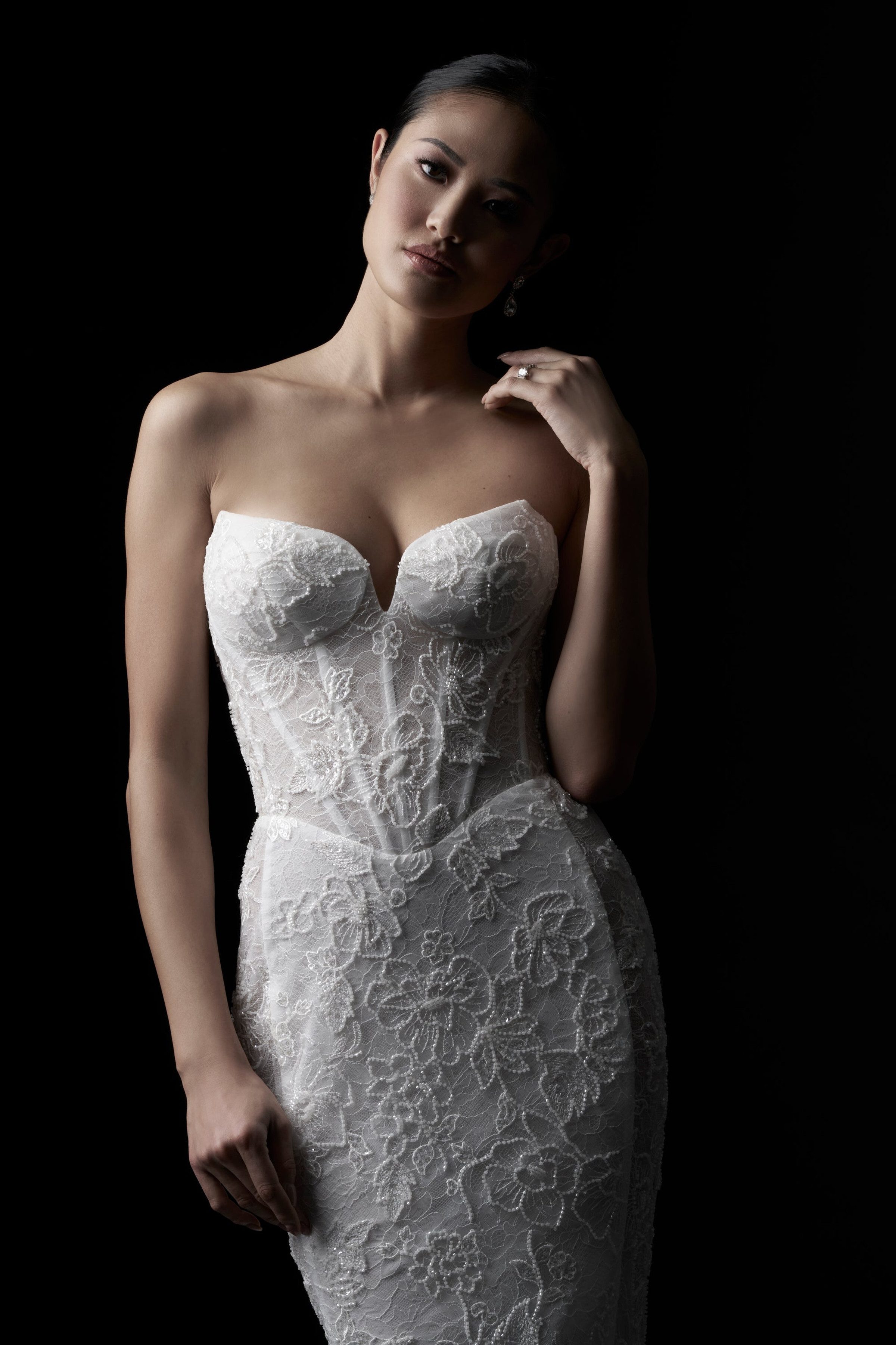 Show off your curves in this striking strapless fit and flare bridal gown. Adorned with delicate beading and embellishment on the all-over lace dress. Strapless sweetheart neckline on a soft Basque waistline oozes glamour.