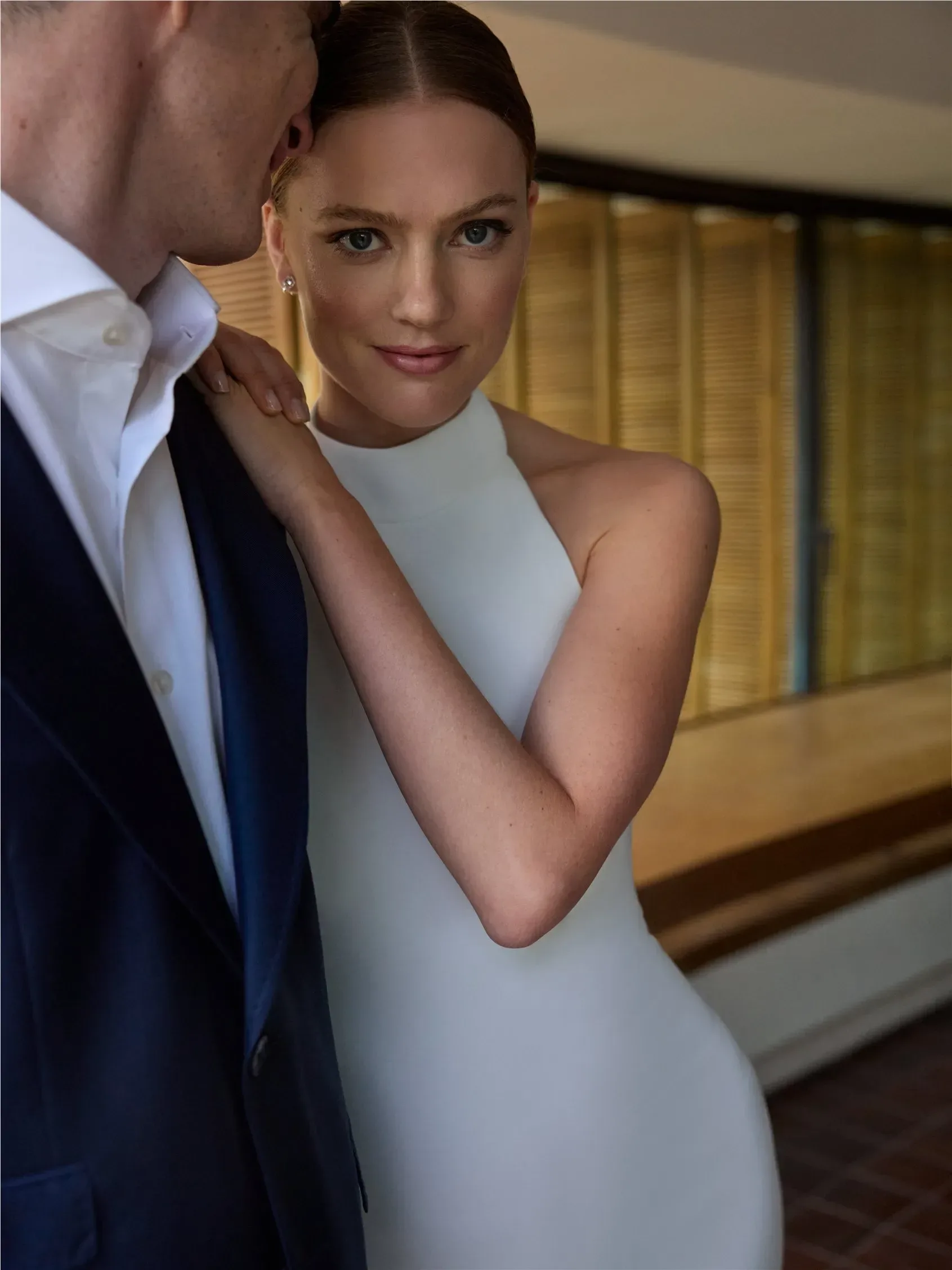 Introducing the effortless console bridal gown. Halter-neck style with the low back and fit and flare silhouette. Complete the look with a sheer airy cape to add movement.