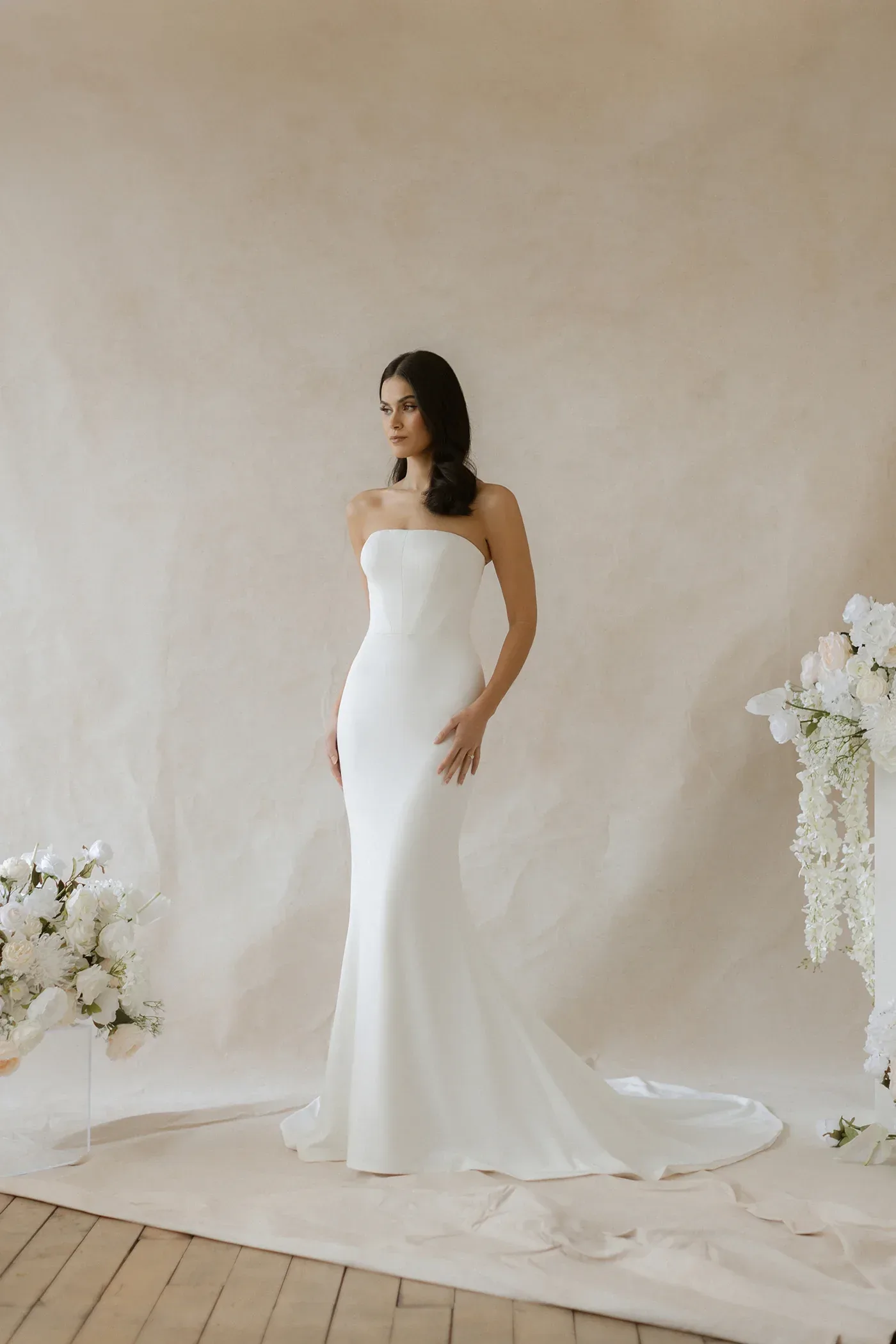 Modern clean lines on the striking strapless fit and flare gown. Crafted in the stretch crepe to create the perfect silhouette for all brides, Geer is a must try on for all.