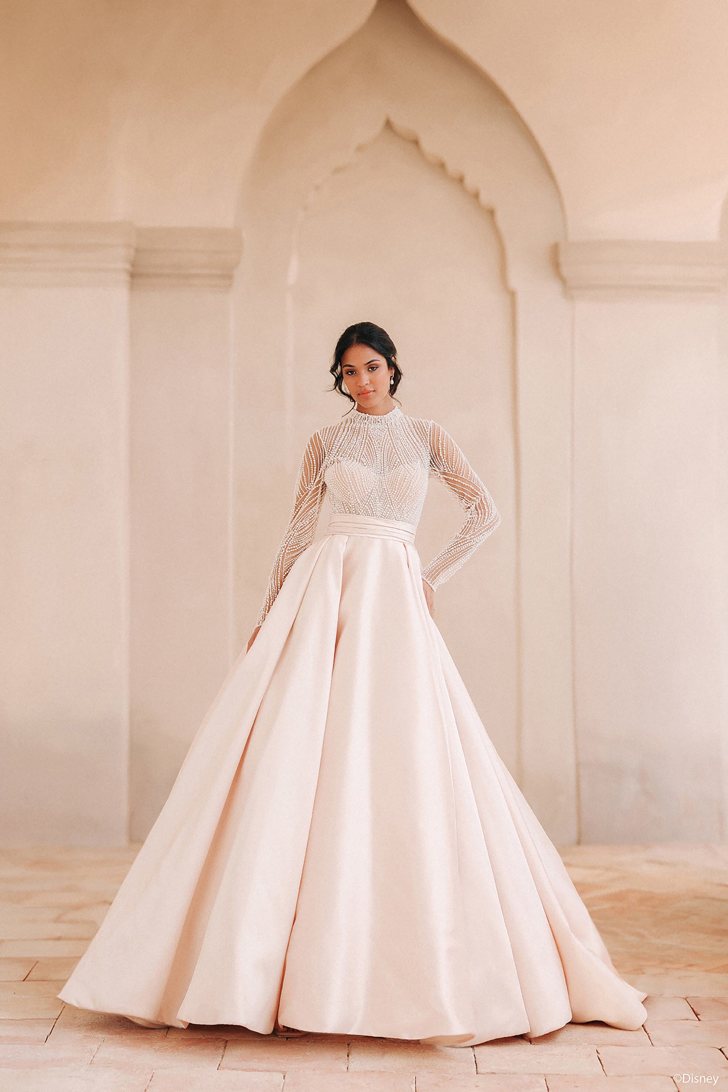 A tribute to strength, luxury and beauty is the brand new Jasmine dress. Crafted in the most luxurious golden Mikado ballgown with a pearl encrusted long sleeves bodice. A true showstopper for all brides to wear.