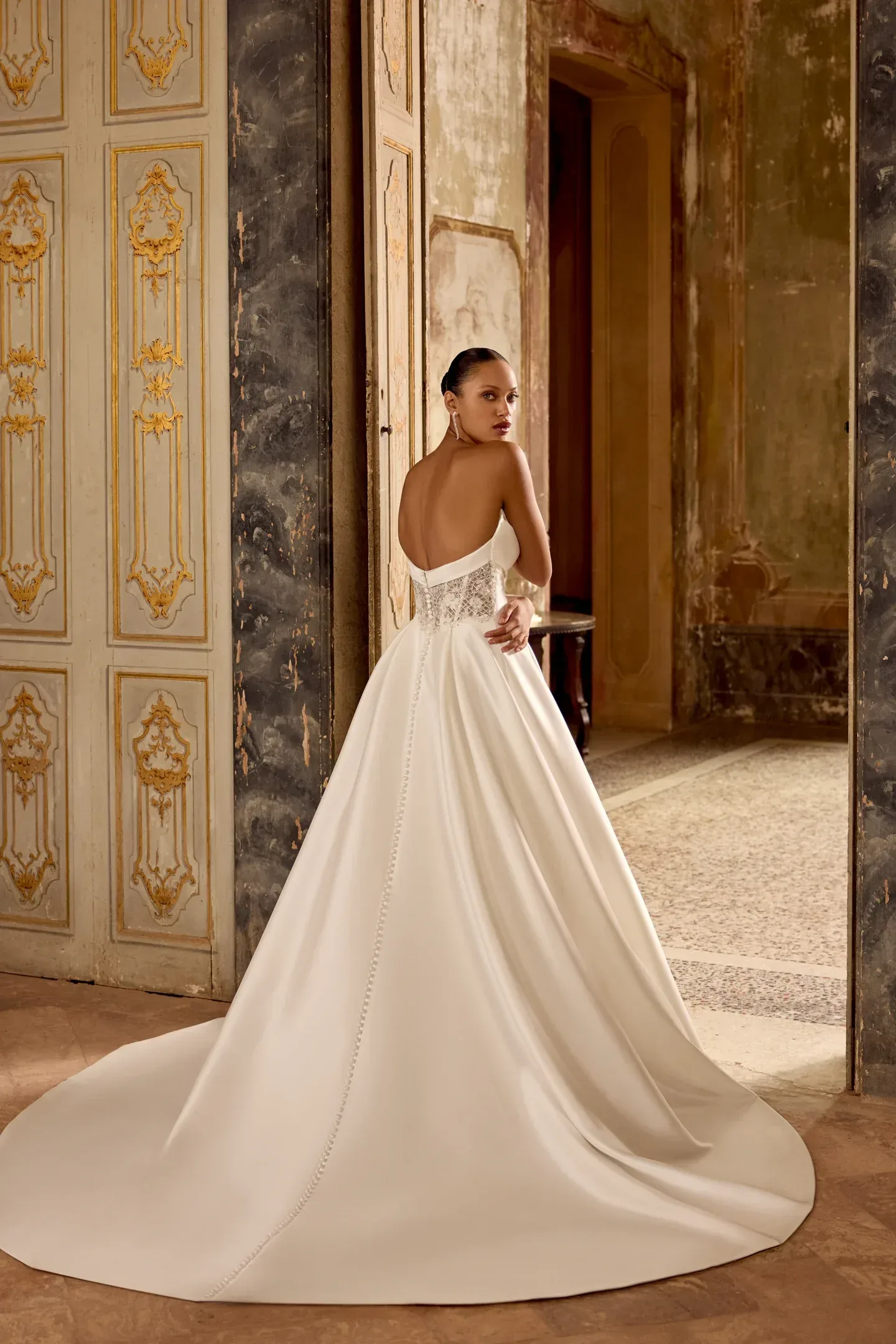 Show off your figure in the stunning fit and flare stretch crepe bridal gown. Ruched strapless detail with the lace embellished appliqués on the bodice flowing down the gown.