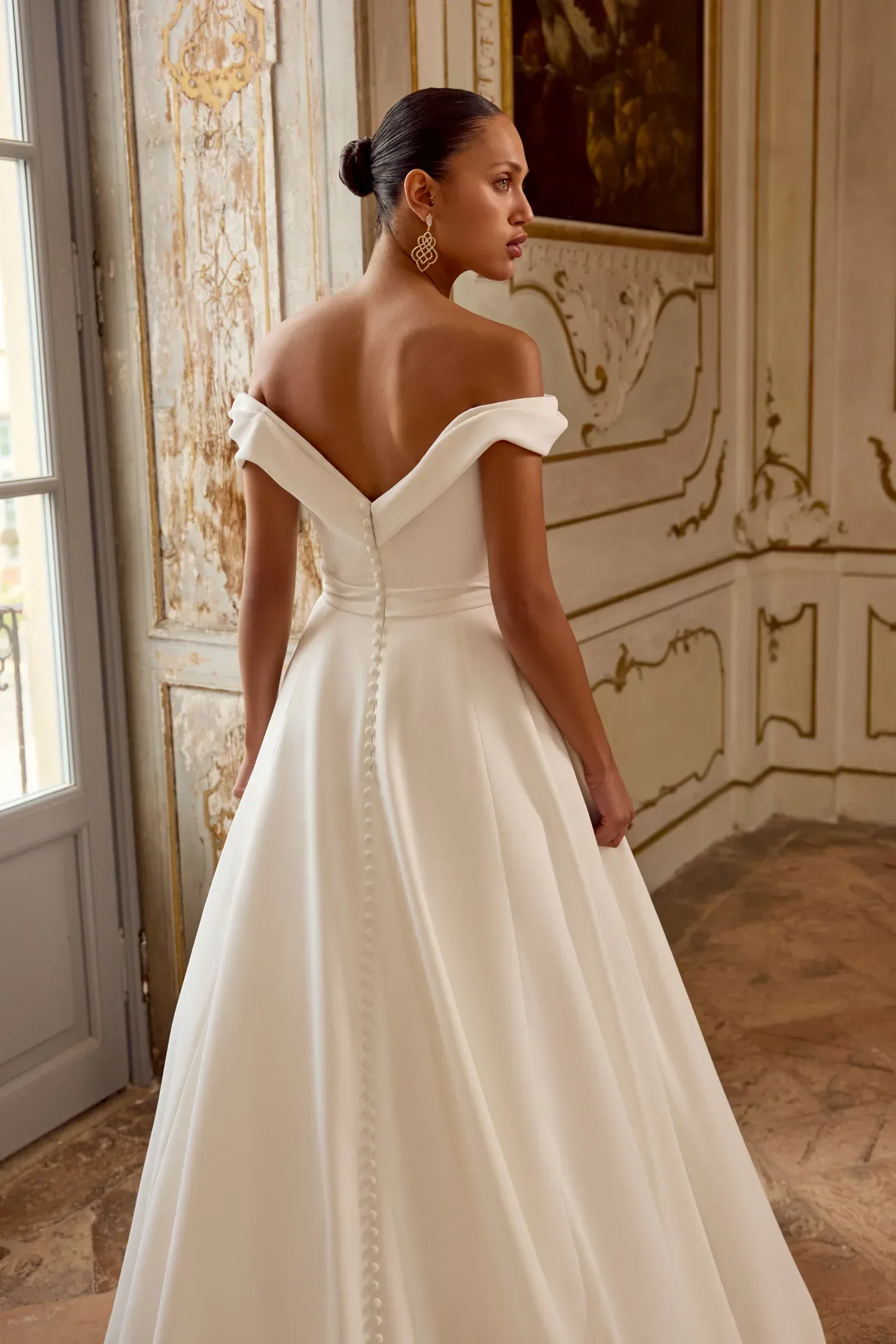 Striking A-line satin bridal gown y Justin Alexander. soft flowing dress with he ruched fitted bodice and off the shoulder strap detail.