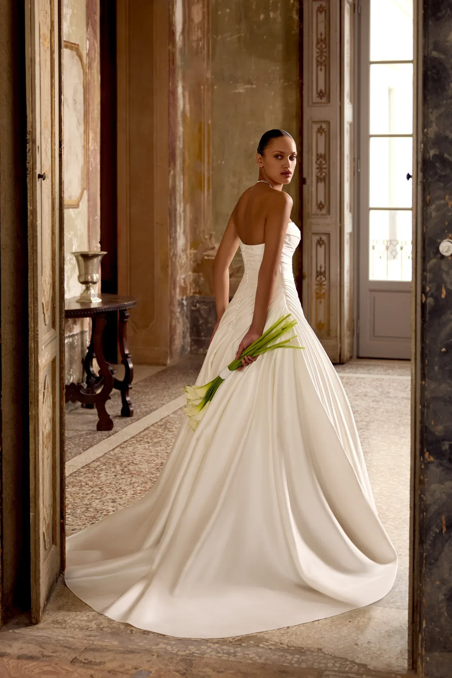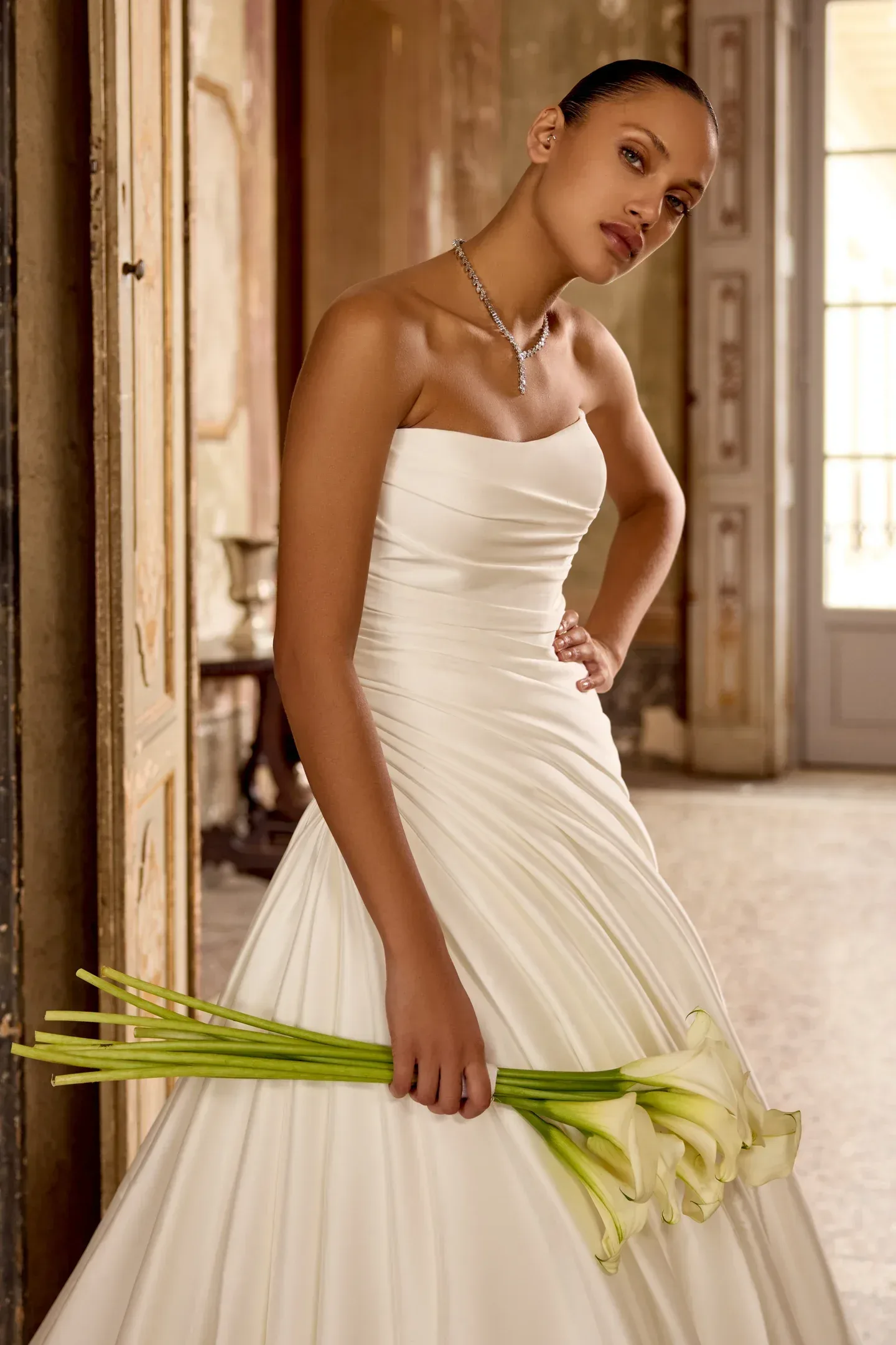 It's all about the Mikado pleats in this A-line bridal gown by Justin Alexander. Strapless design with a delicate dip detail.