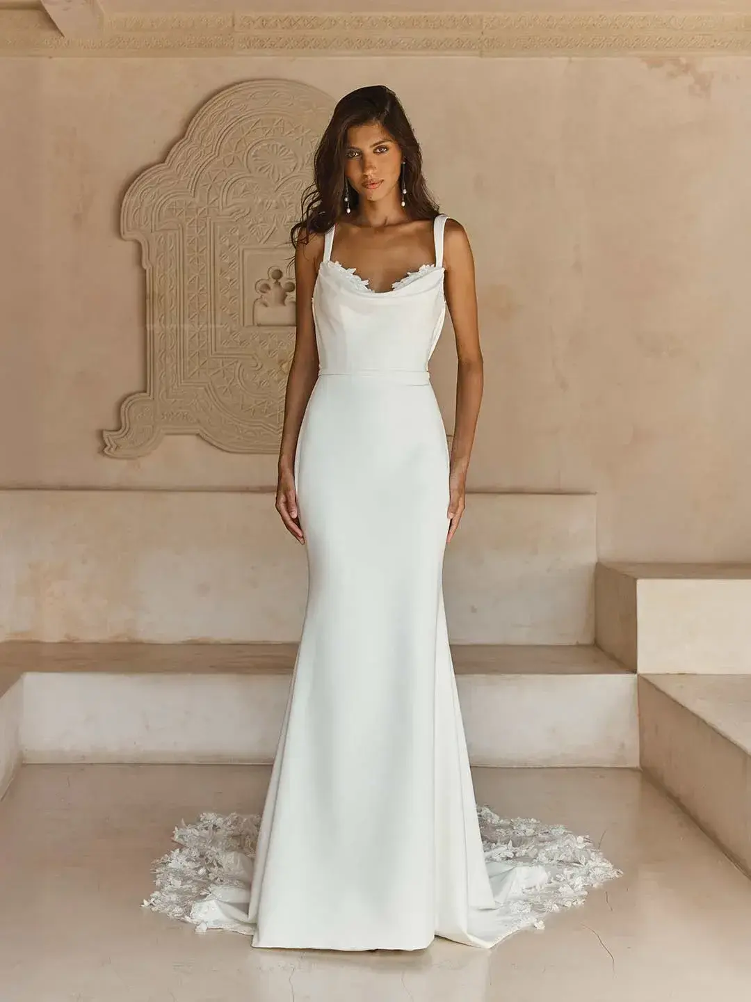 Simply elegant Lanette by Madi Lane. Showing off the brides figure to perfection in the fit and flare crepe now. Strap dress with the scoop low back and the sweetheart neckline. Lace detail adorns the neckline and the illusion train.