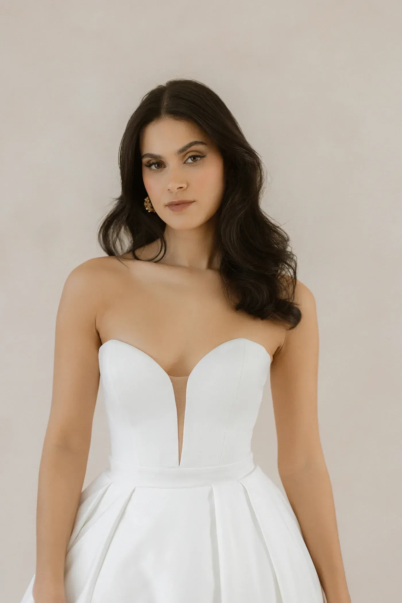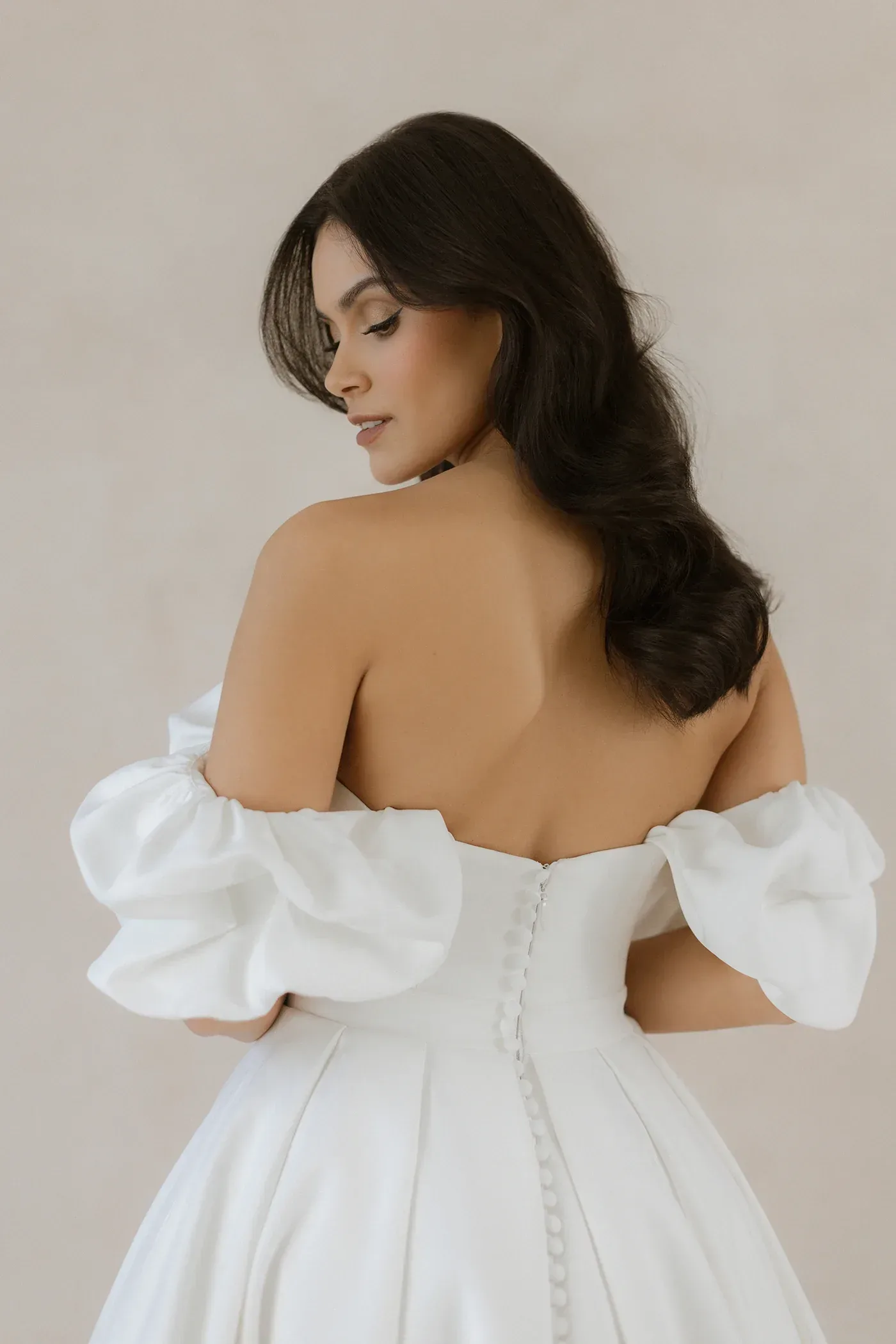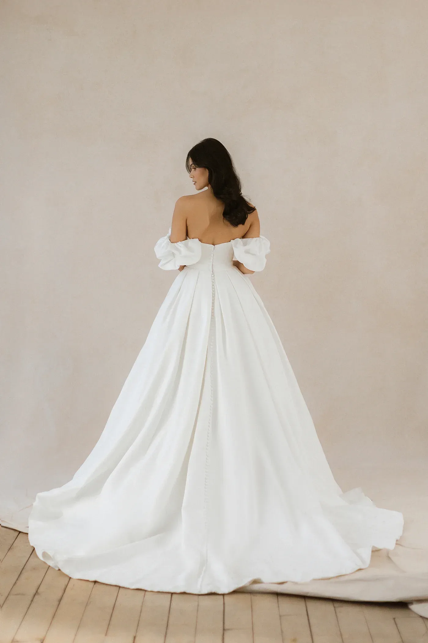 Le Brun, a timeless ballgown with a pure elegant finish. Crafted in luxurious satin, with the off-the-shoulder sweetheart neckline while the detachable straps offer versatile styling. The full, sweeping skirt creates a dramatic silhouette.