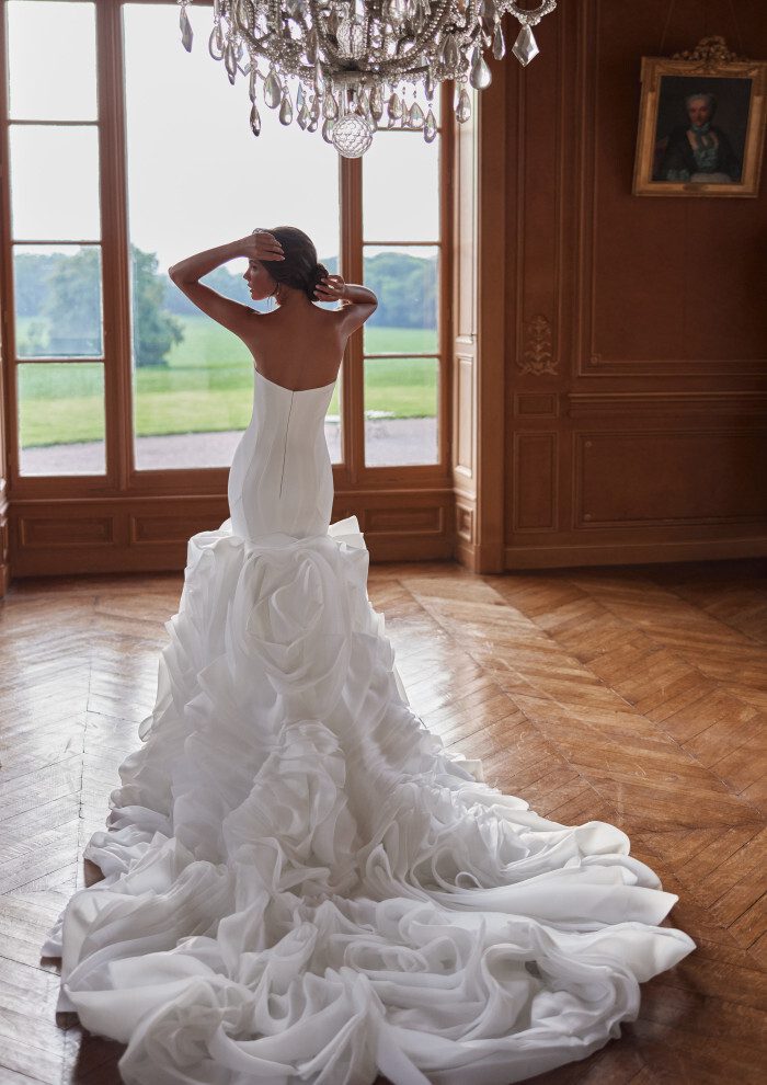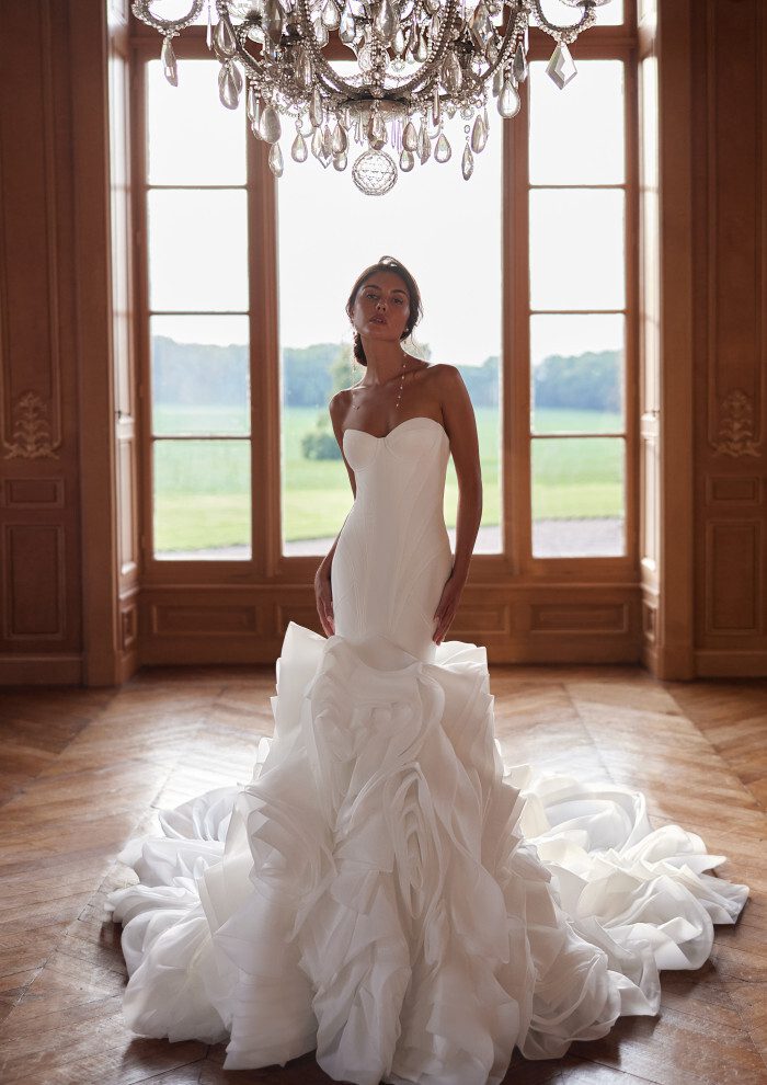 An unforgettable gown is the brand new Maia from Yedyna. Sweetheart strapless gown with the exposed boning structured used throughout to create curves. Full layered mermaid Matt organize skirt for that extra drama.