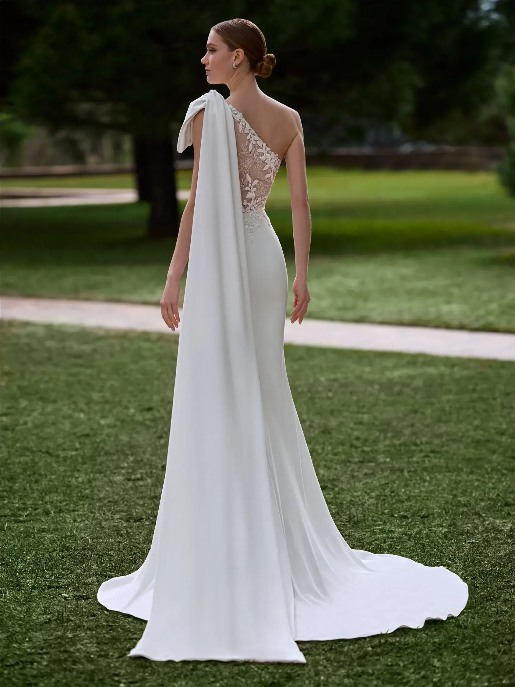 Show off your figure in this stunning Neua bridal gown. With the asymmetric neckline that is complemented by a detachable train that dramatically falls from the shoulder. Completed with the lace appliqués used down the sides.