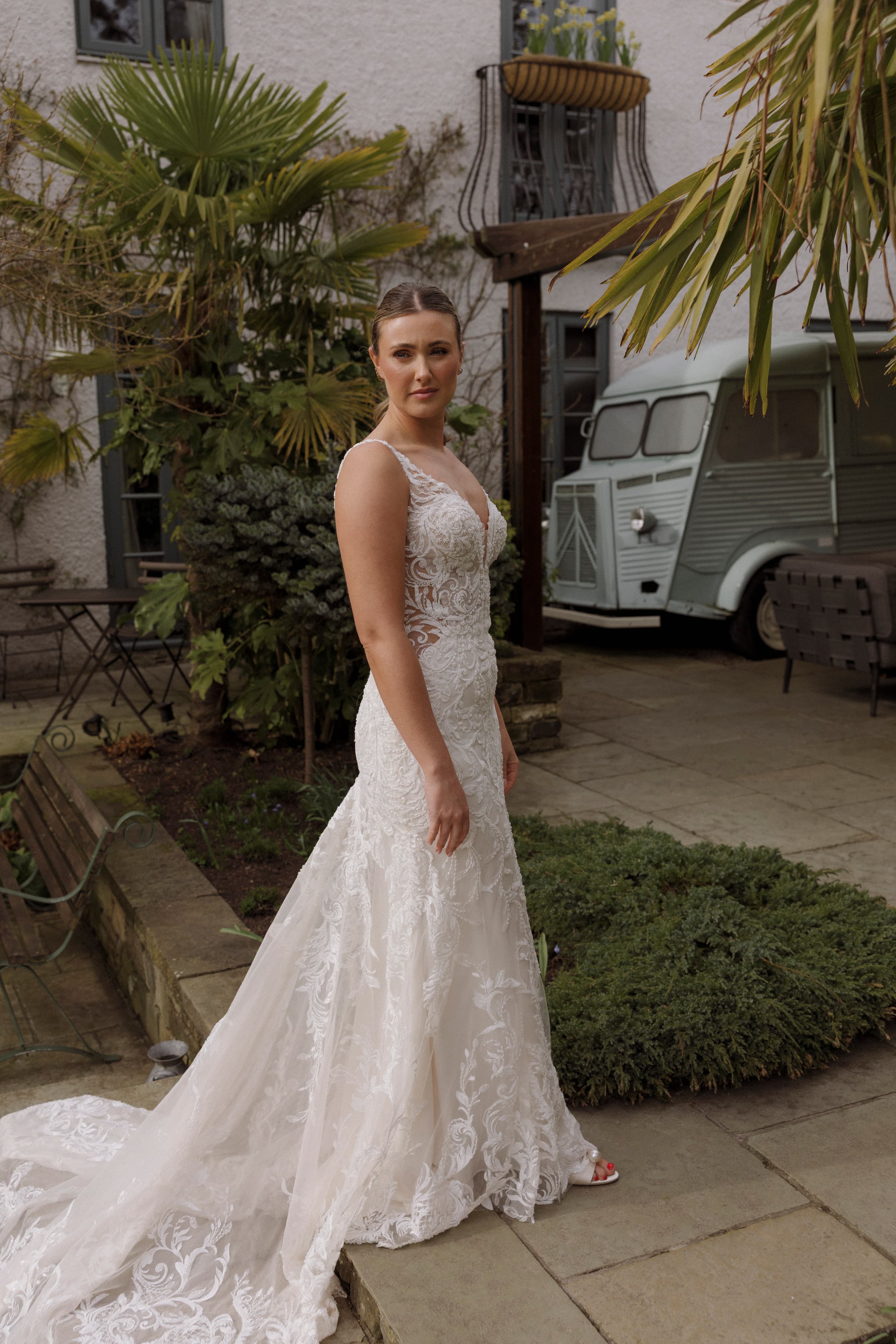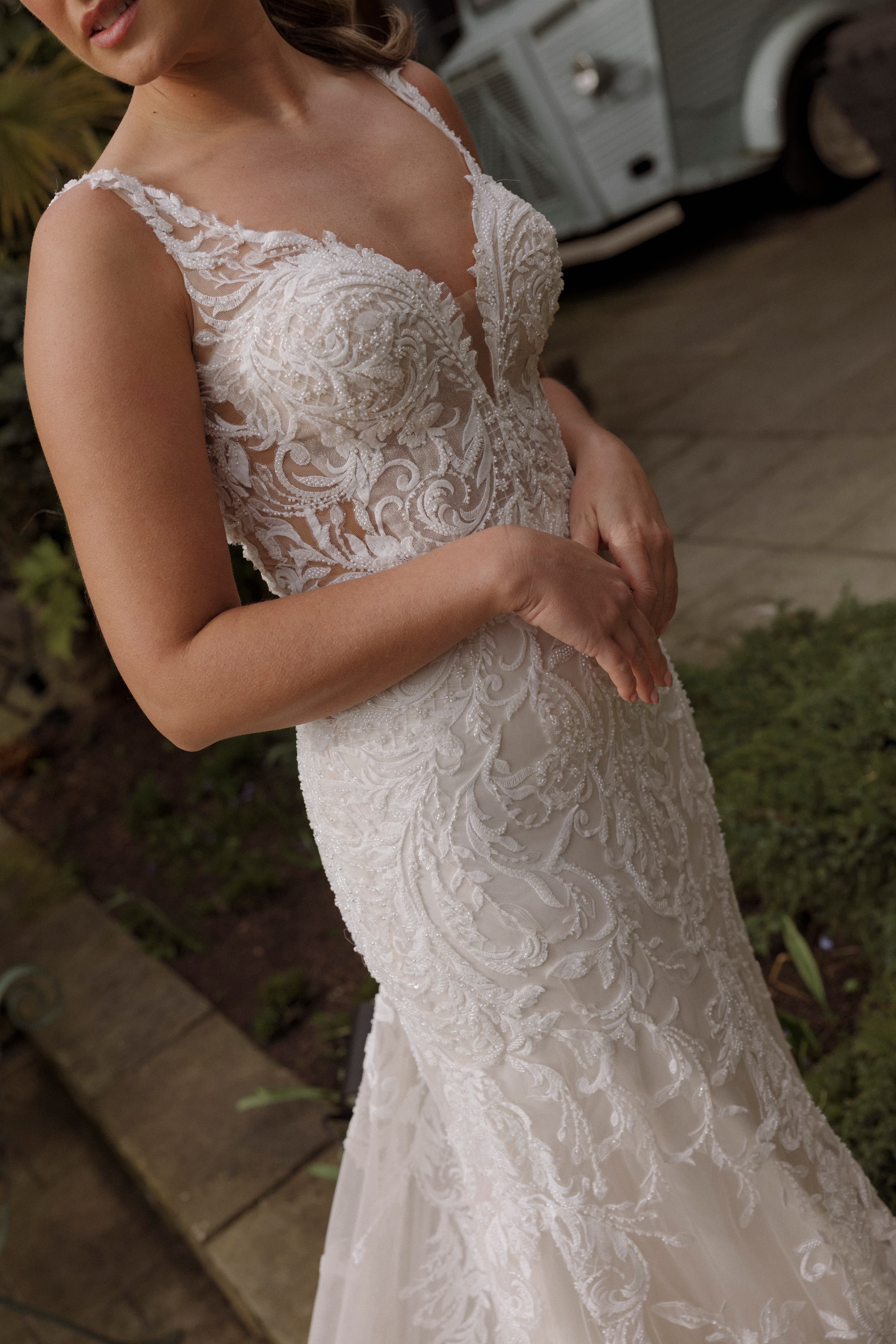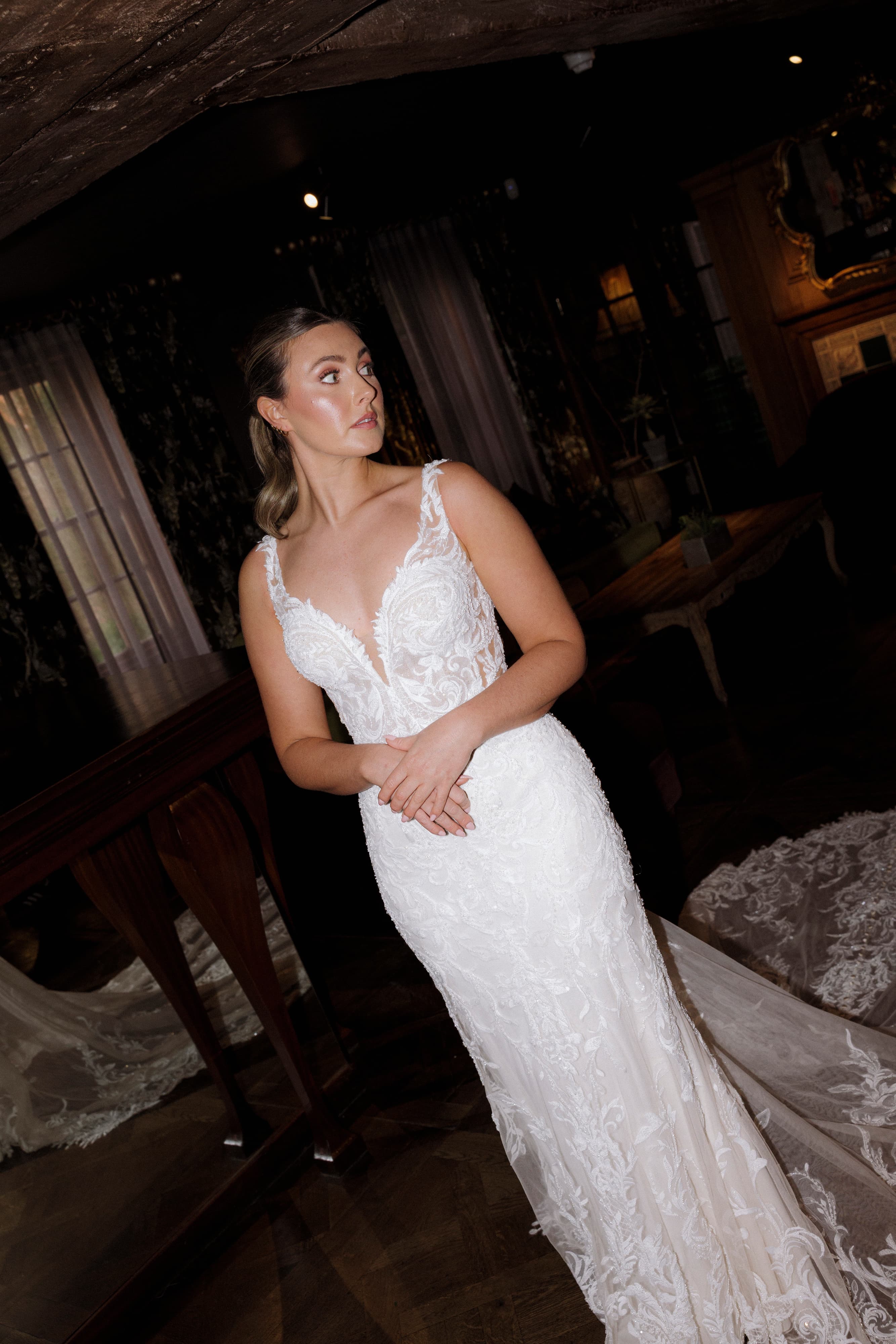 It's all about the ornate lace on this stunning Noir gown. Featuring a plunging neckline with a deep scoop back and a fit and flare silhouette.