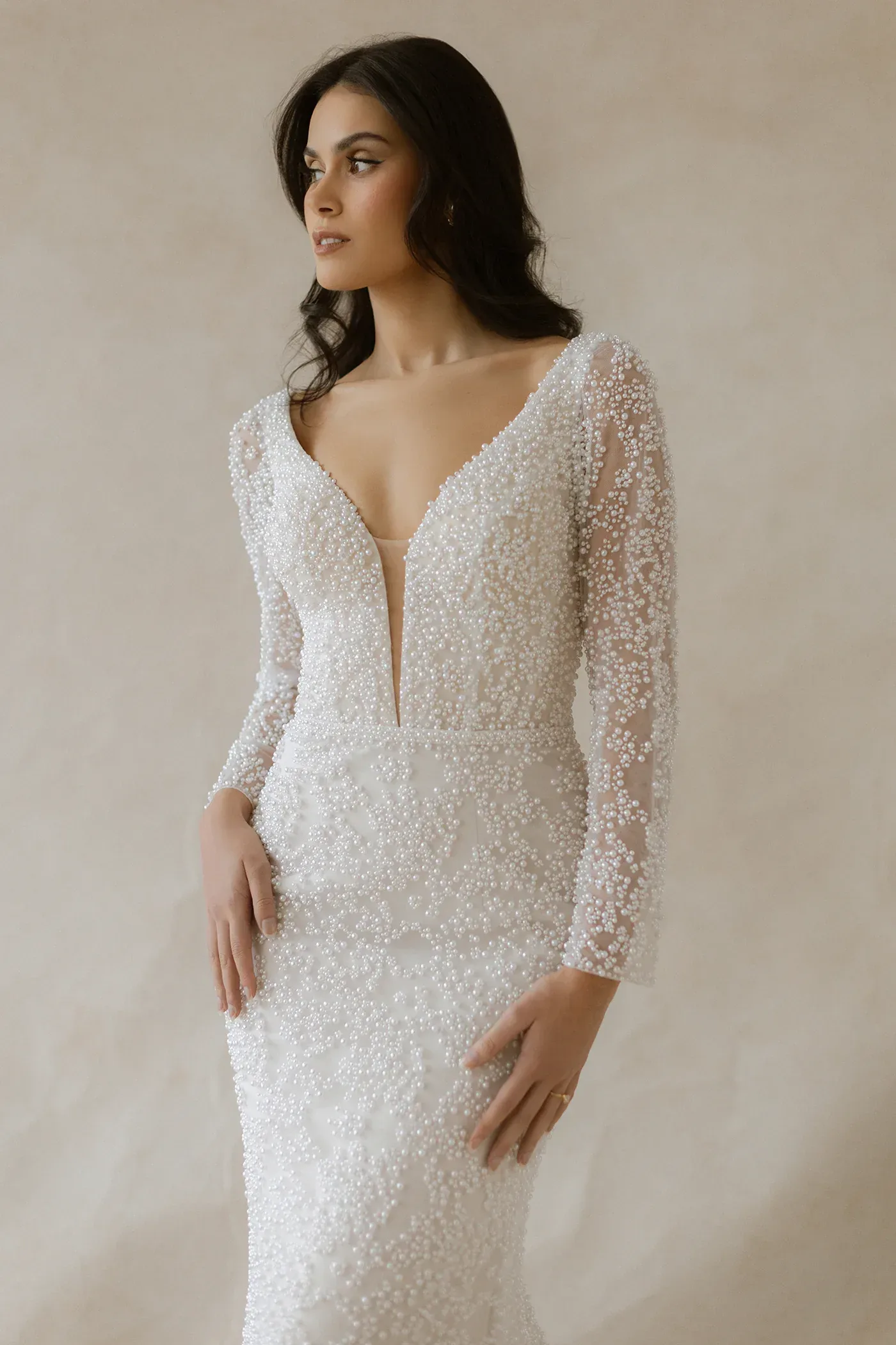 Piper, the long sleeved beauty by Abella. Pearl-studded bridal gown is sure to turn heads at any Wedding. Long fitted sleeves with the plunging neckline on the fit and flare silhouette dress.