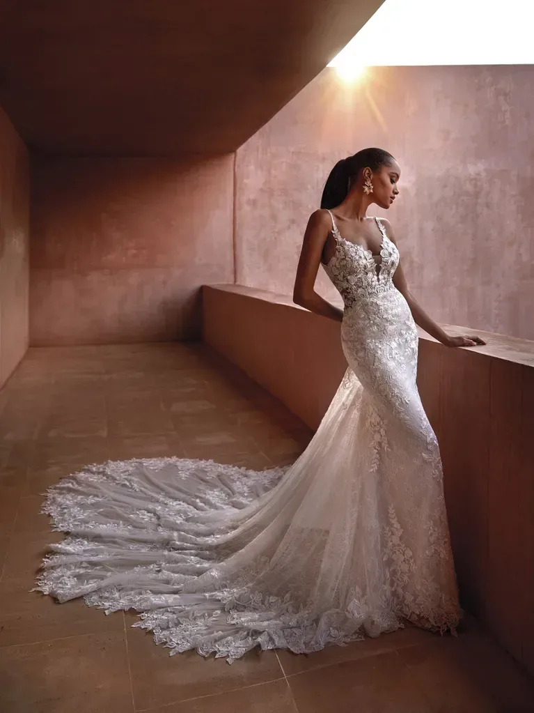 Show off your curves in the beautiful Seychelles gown. Spaghetti straps hold the plunging neckline bodice and the fit and flare dress design. The wow train is a sight to be seen, crafted in the delicate lace and embellishment throughout.