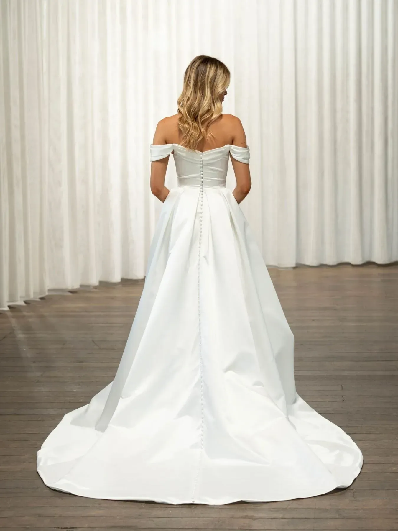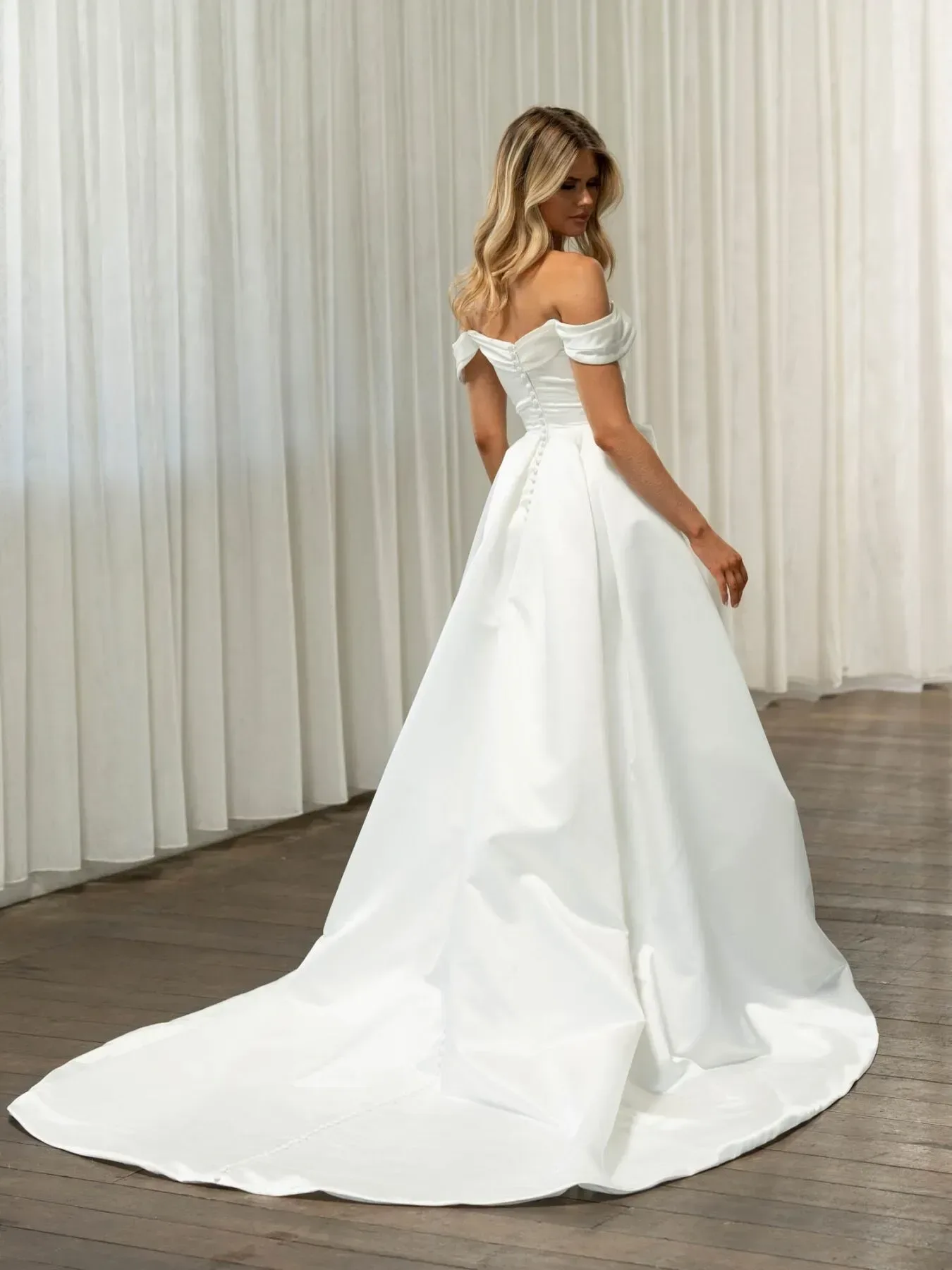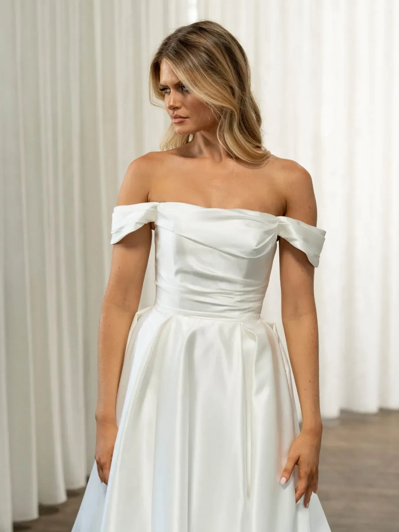 Traditional yet modern ballgown crafted in the most luxurious satin. Pleated detailed bodice with off the shoulder straps set on the flowing ballgown.