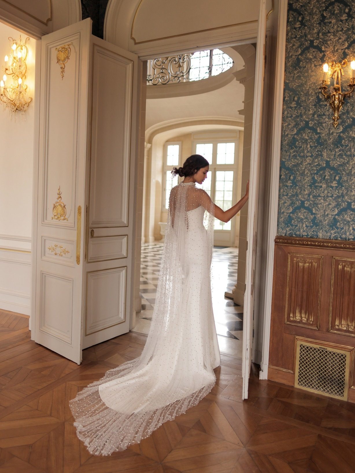 Modern and chi bridal gown Tucker is a sight to be seen. Crafted in the stretch crepe to give the perfect fit and flare silhouette, with the sweetheart strapless neckline and cut out detail. Complete the look with the sheer and pearl cape.