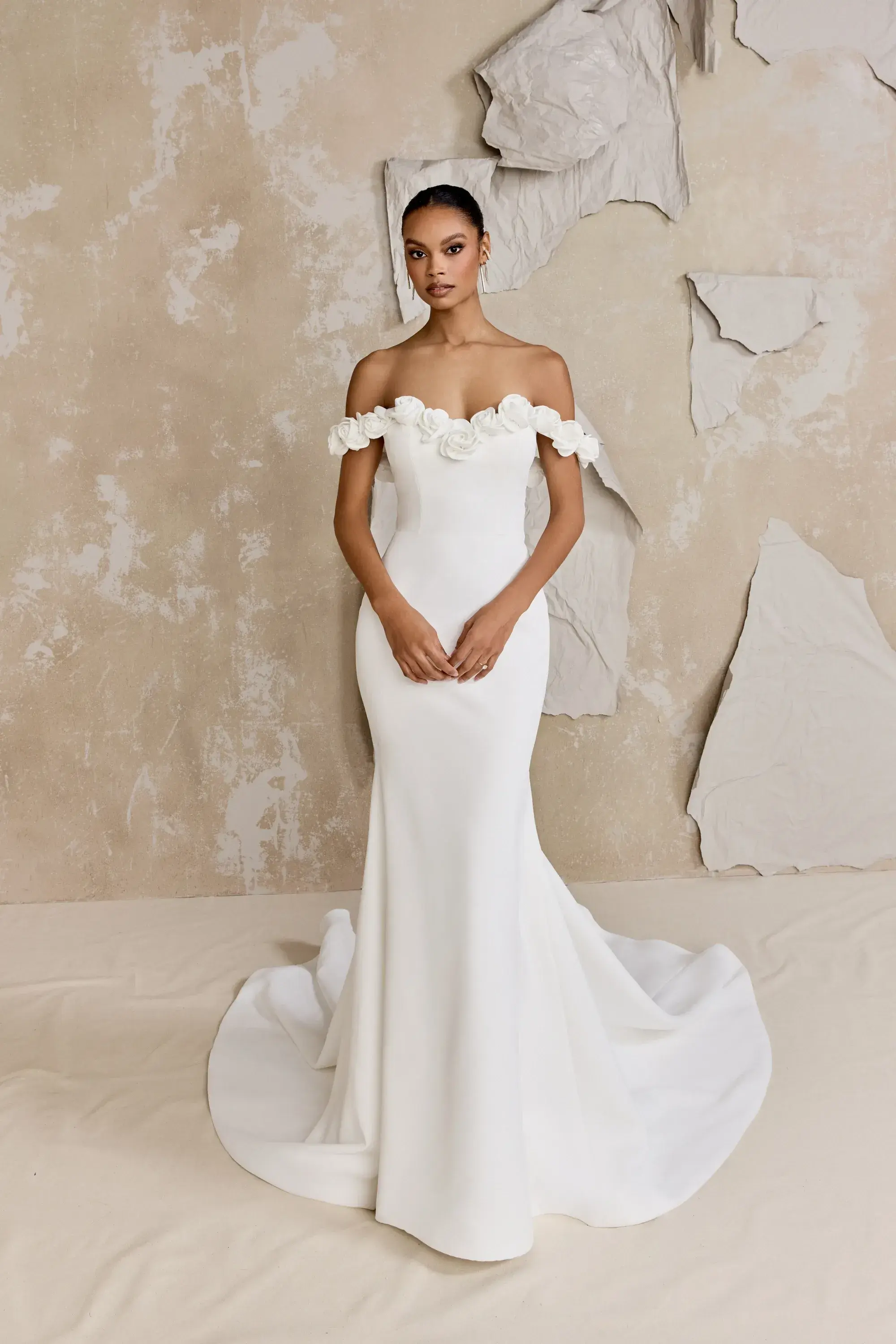 Strikingly stunning Walcott bridal gown by Justin Alexander Signature. Off the shoulder detail with the Rosette detail for that extra wow/ Crafted in the satin fabric in the fit and flare silhouette.